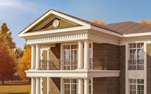 Колонны, рустовые камни, пилястры, молдинги, арки на окна и двери, баласины в ограждении балконов - придают классический стиль фасаду дома. Открытая терраса с кованным ограждением придают вид дому царской постройки 18-19 веков.