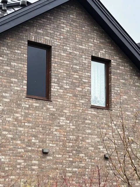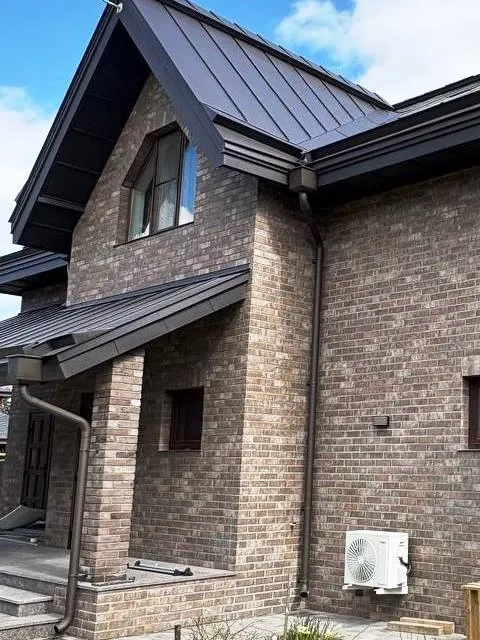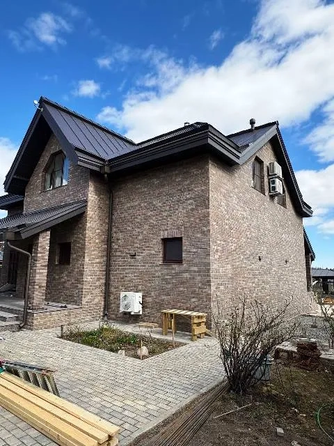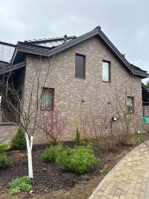 Отделка стен коттеджа снаружи декоративной плиткой под кирпич.