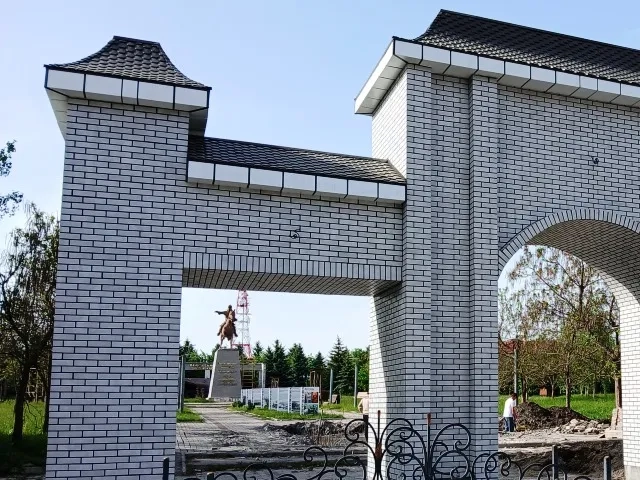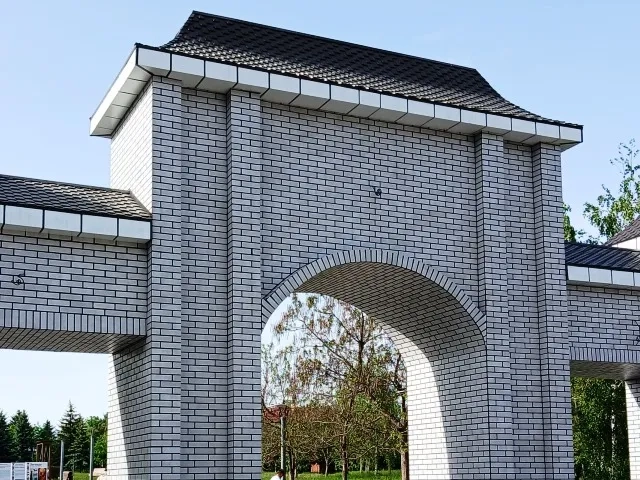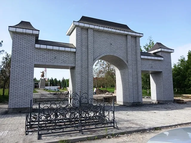 Въездные парадные ворота, фото облицовки декоративным камнем с видом кирпича.