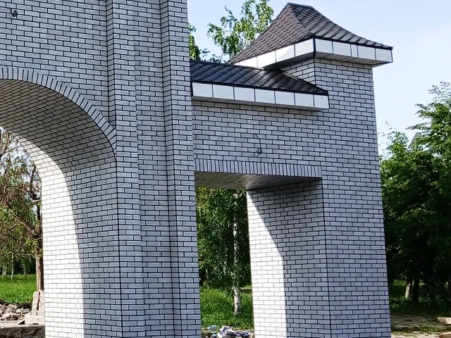 Сделаем отделку сложных радиусных арок и поверхностей стен, любым видом искусственного камня или облицовочной плитки (керамогранит, мрамор, клинкер, и т. д.). На фото колонна арочная, облицовка декоративной плиткой под кирпичную кладку светлого цвета.