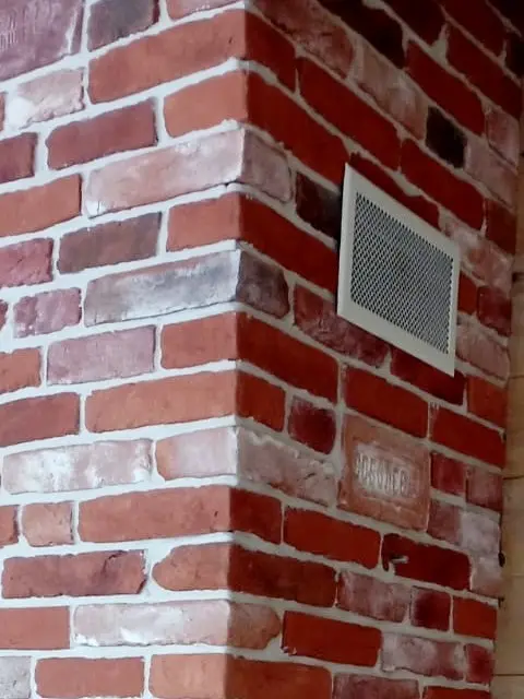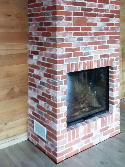 Отделка каминной топки и короба дымохода сделана камнем с формой и видом кирпичной кладки коллекции "Кронштадт". Варианты расцветок декоративного камня для внутренней или наружной отделки коллекции "Кронштадт". В каталоге можно выбрать другой цвет.