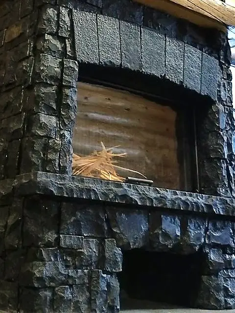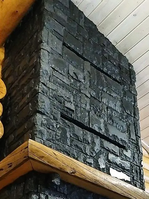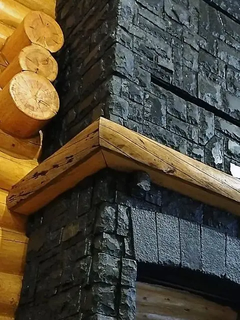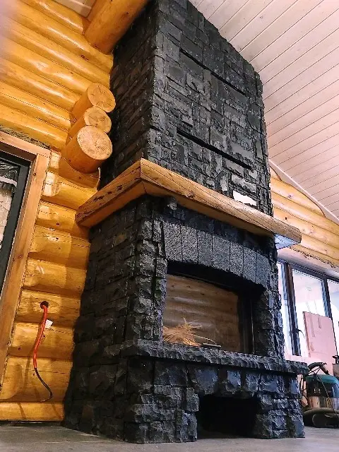 Отделка касетного камина, в частном деревянном доме из бревна, сделана искусственным камнем с видом природного камня темно-серого цвета. Для отблицовки мы взяли камень от производителя фирмы Вип Камни (Vip Kamni) коллекция "Утес" .