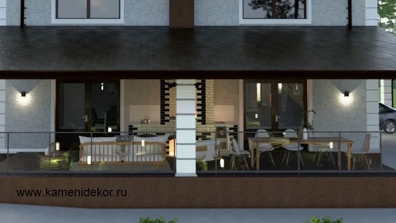 Вариант отделки снаружи дома с пристройкой, цоколя, водостоки, навес, свесы кровли, крыльцо, мощение, ландшафт загородного участка.