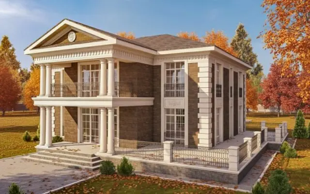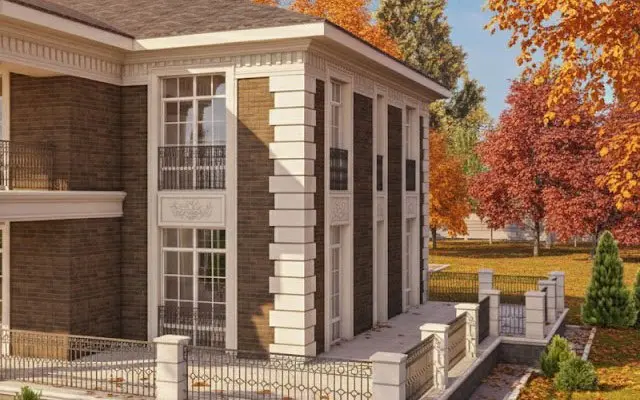Вариант фасадной отделки частного дома, дизайн проект облицовки камнем и декором.