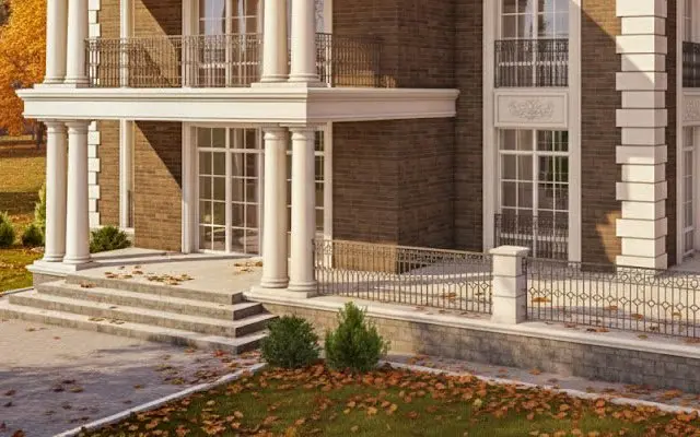 Колонны, рустовые камни, пилястры, молдинги, арки на окна и двери, баласины в ограждении балконов - придают классический стиль фасаду дома. Открытая терраса с кованным ограждением придают вид дому царской постройки 18-19 веков.