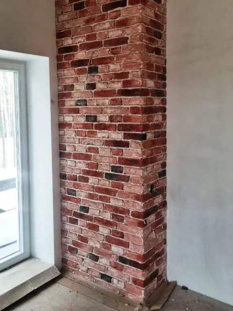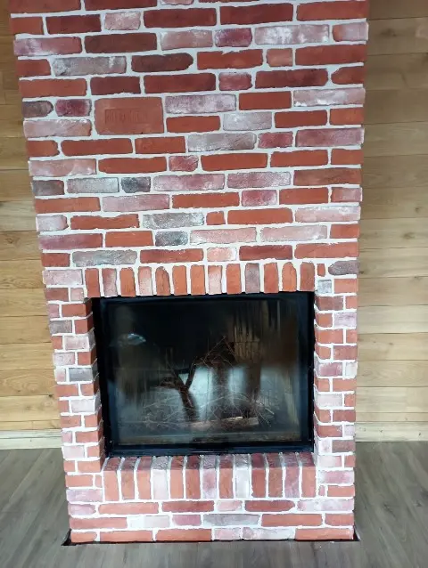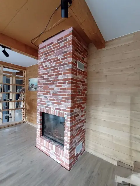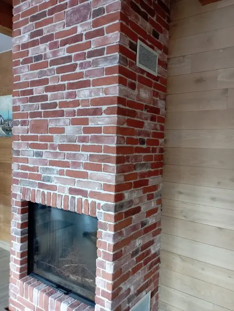 Отделка каминной топки и короба дымохода сделана камнем с формой и видом кирпичной кладки коллекции "Кронштадт". Варианты расцветок декоративного камня для внутренней или наружной отделки коллекции "Кронштадт". В каталоге можно выбрать другой цвет.